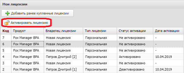 5. Выберите одну из неактивированных лицензий в своей учётной записи в разделе «Мои лицензии» на портале https://fox-manager.com/cp/ и нажмите кнопку «Активировать лицензию».