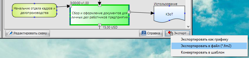 Пользователь может перенести в свою базу данных схемы процессов из других баз данных. Для этого нужно сначала экспортировать схему процесса, построенную в редакторе процессов в формат *.fm2 из справочника «Дерево процессов».