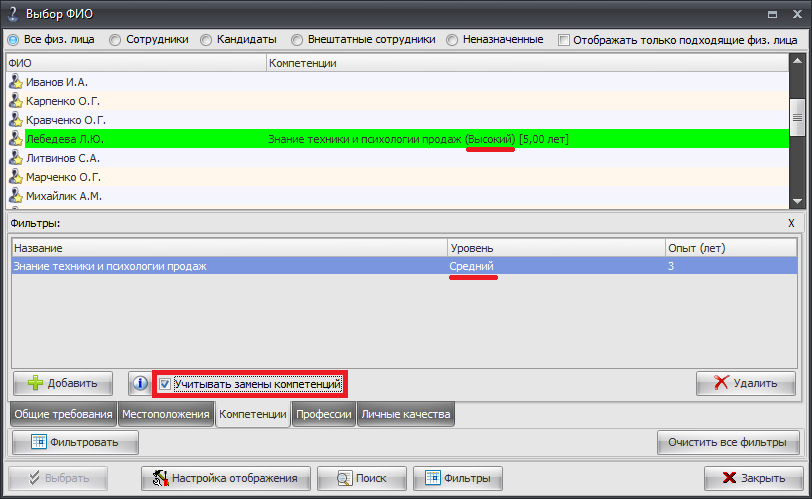 Как видите, в требованиях к должности у нас прописана компетенция «Знание техники и психологии продаж» на среднем уровне, в то время, как сотрудник «Лебедева Л.Ю.» имеет высокий уровень знаний по этой компетенции. По умолчанию программа не будет выделять данного сотрудника как подходящего для должности, но при активации опции «Учитывать замены компетенций» данный сотрудник будет выделен, так как его уровень знаний превышает заданные требования.