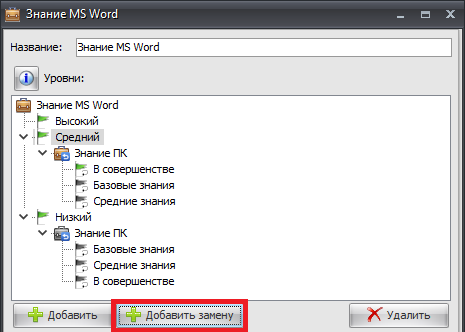 Иногда одни компетенции более широкого профиля уже могут включать в себя другие более специализированные компетенции. Например, компетенция «Знание иностранных языков» уже включает в себя компетенцию «Знание английского языка». Или компетенция «Владение ПК» с уровнем «В совершенстве», скорее всего, уже включает в себя компетенцию «Работа в MS Word». Советуем избегать таких ситуаций и указывать равнозначные по охвату компетенции, если же этого не удаётся сделать, то указать замещение компетенций можно вручную в списке уровней компетенции при помощи кнопки «Добавить замену».