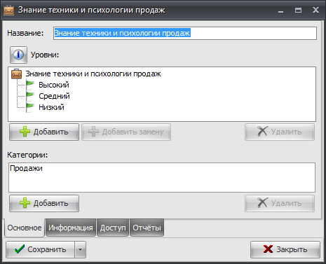 Уровни компетенции определяют уровень знаний сотрудника или должности. У каждой компетенции должен быть минимум 1 уровень. Чем выше элемент в списке, тем лучше знания по данной компетенции. Вы можете использовать текстовые обозначения уровней, например, «Базовые знания», «Хорошие знания» и т.п., или ввести цифровую градацию, например, от 1 до 10. Более высокий уровень компетенции (тот, который стоит в списке выше) всегда может заменить более низкий. Например, сотрудник, которые обладает компетенцией «Знание английского языка» на уровне «Cредний» всегда сможет выполнить функции сотрудника с компетенцией «Знание английского языка» на уровне «Базовый».