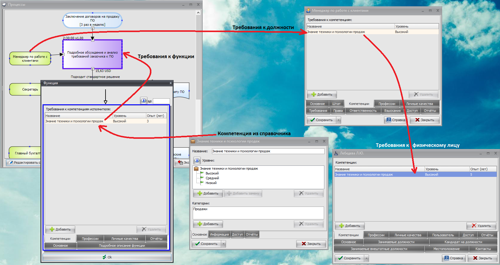 На диаграмме видно, что для функции «Подробное обсуждение и анализ требований заказчика ПО» установлено требование к компетенции исполнителя «Знание техники и психологии продаж» с уровнем «Высокий» и опытом 3 года. Исполнителем данной функции является «Менеджер по работе с клиентами», соответственно в карточке на данную должность также необходимо обозначить требование к владению компетенцией «Знание техники и психологии продаж» с уровнем «Высокий». Должность «Менеджер по работе с клиентами» занимает «Лебедева Л.Ю.». В карточке физического лица указано, что Лебедева Л.Ю. обладает компетенцией «Знание техники и психологии продаж» с уровнем «Высокий» и опытом 5 лет. Соответственно её компетенции соответствуют требованиям должности, которую она занимает, в то же время требования к должности соответствуют требованиям, установленным в функции процесса, а значит наша модель сбалансирована.