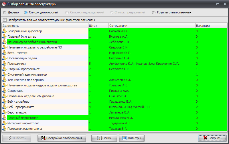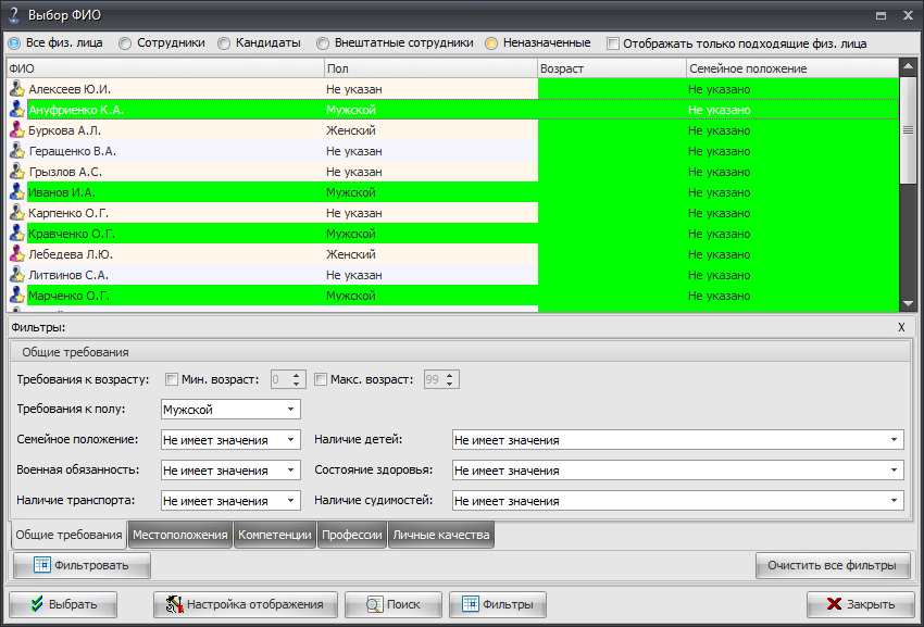 Разумеется, такой баланс достигается не всегда. В карточке на физическое лицо необходимо обозначать реальные компетенции, которыми обладает сотрудник, не подстраивая их под заранее известные требования. В таком случае при назначении физического лица на вакантную штатную единицу, программа будет выделять тех физических лиц, которые соответствуют требованиям должности, а пользователь сможет самостоятельно настроить фильтры если, например, возникнет потребность смягчить некоторые требования или изменить критерии подбора.