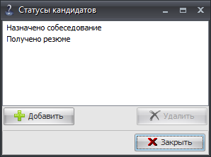 Программа Fox Manager BPA позволяет вести учёт кандидатов на должности. По умолчанию в справочнике имеются два статуса для кандидатов: «Назначено собеседование» и «Получено резюме», но пользователь может самостоятельно необходимые для работы статусы в справочнике «Статусы кандидатов».