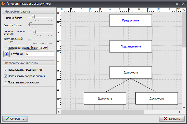 Вы можете задать предварительные настройки: размеры блоков, отступы, отображаемые на схеме элементы, а также глубины схемы, начиная от элемента, который вы задали в карточке на схему.