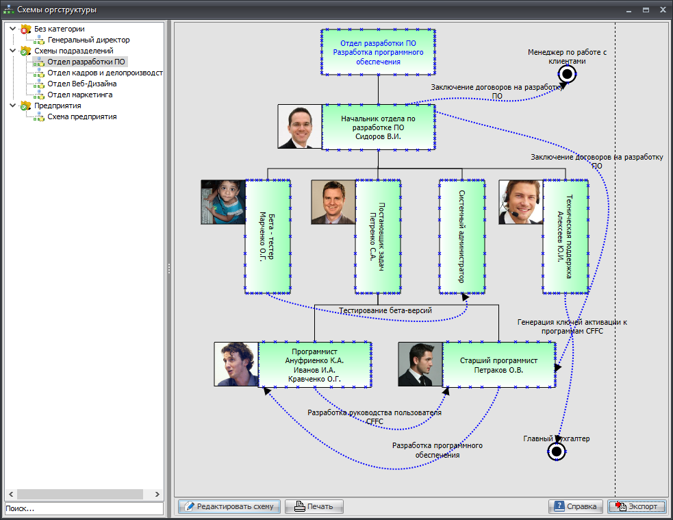 Но иногда возникает необходимость построить схему в полуавтоматическом режиме с возможностью ручного редактирования и отображения дополнительных связей. Для этого предназначен справочник «Схемы оргструктуры»