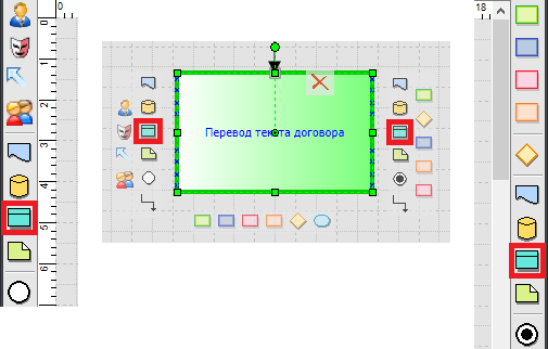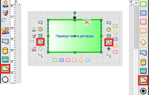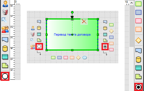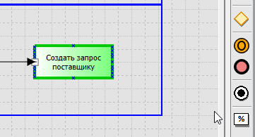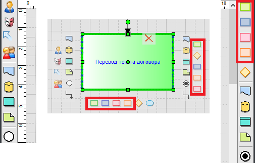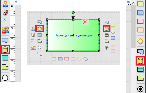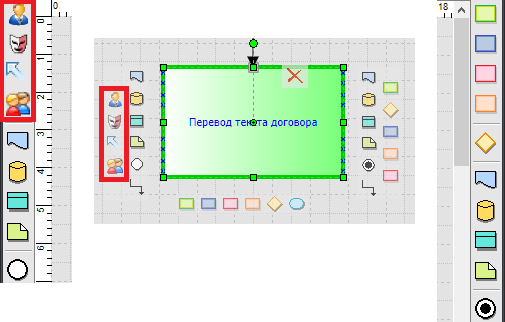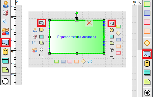 Добавление устной информации на схему процесса производится при помощи панелей инструментов по бокам или из всплывающего меню, которое возникает при наведении на активный блок в редакторе процесса. Элемент расположенный слева от функции будет считаться входящим, а справа – исходящим.