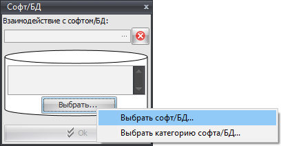 В карточке можно указать какое действие с ними происходит в данной функции (создание, использование и т.п.), а также выбрать софт/базу данных или категорию софта/БД при помощи кнопки «Выбрать…»