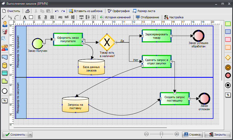 В этой нотации дорожки с ответственными располагаются горизонтально, а описание процесса принято отображать слева-направо.