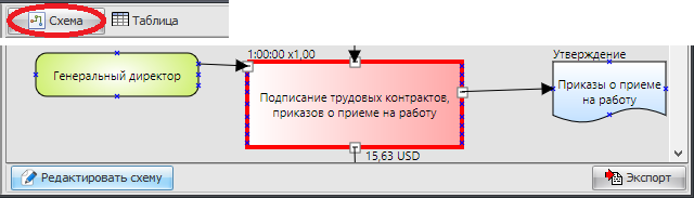 Если выбран режим отображения в виде схемы, то при помощи нижней панели вы сможете перейти в редактор процесса или экспортировать процесс в текстовый редактор.