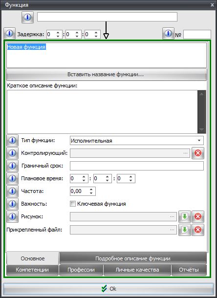 В правом верхнем углу можно указать номер функции в рамках процесса. Номер указывать необязательно, он может быть использован при сортировке функций в отчётах.