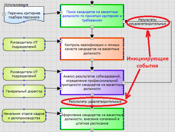 При помощи входящих и исходящих ссылок вы можете установить связи между вашими процессами, которые будут видны на схеме взаимодействий, а также показать движение элементов в процессах, например, документов и ресурсов, которые будут видны на схемах движений.