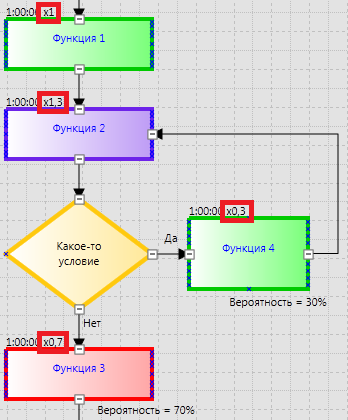На рисунке мы видим, что в процессе «Функция 1» всегда будет выполняться 1 раз, а «Функция 2» будет выполняться чаще, из-за того, что есть вероятность возврата к ней после блока «Решение», в котором содержится какое-то условие, которое влияет на то, какая функция выполнится дальше. Чем больше вероятность возврата к «Функции 2», тем выше будет частота её выполнения. Частота выполнения функций 3 и 4 зависит от вероятности перехода к ним после блока «Решение».