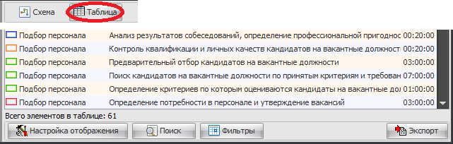 Если же выбран режим отображения в виде таблицы, то вы сможете просматривать функции процессов и категорий в виде таблицы с возможностью поиска, сортировки и фильтров.