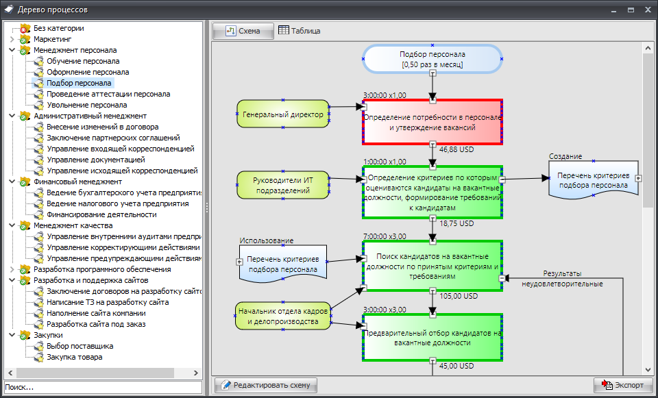 «Дерево процессов» — основной справочник программы, который позволяет строить графические схемы бизнес-процессов, описывая деятельность предприятия и распределяя ответственность за работы среди персонала.