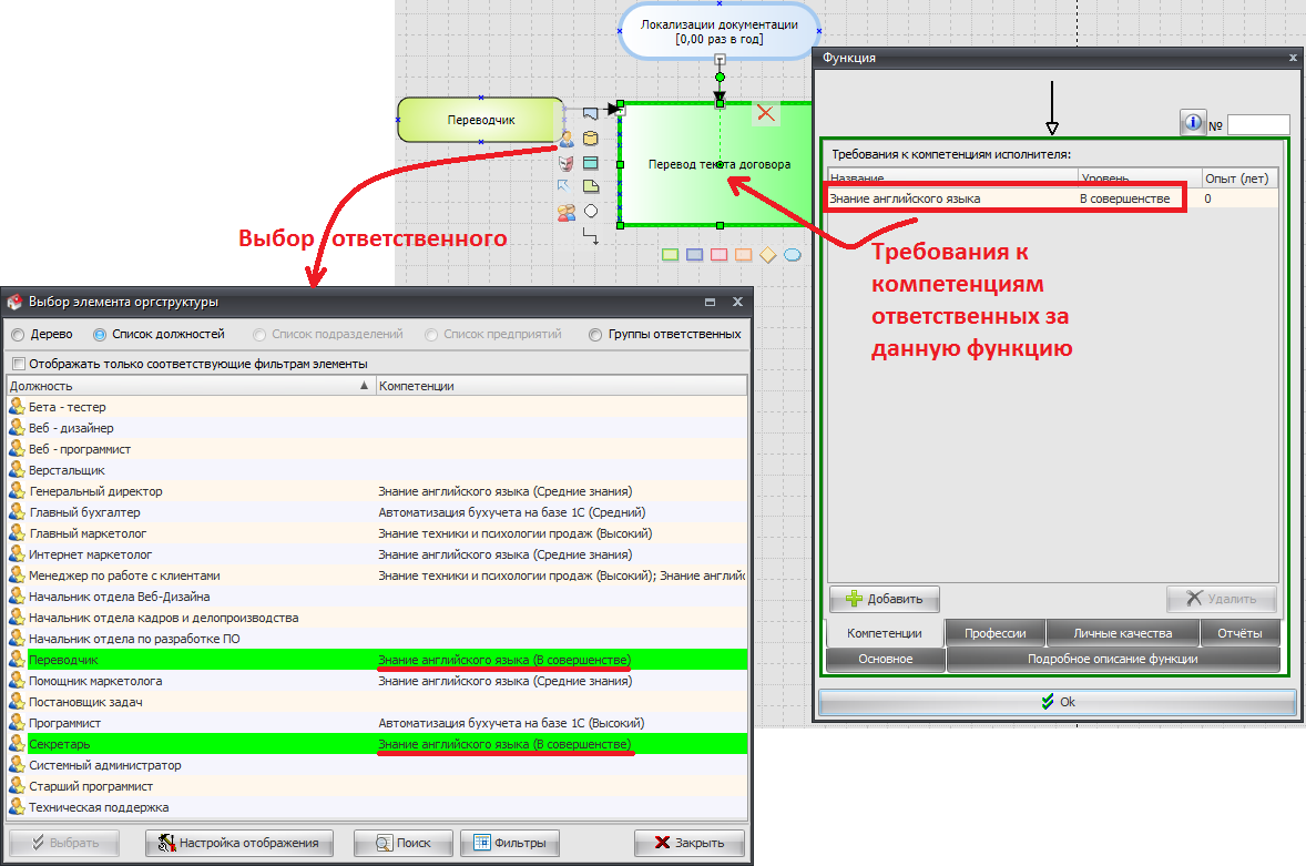 Элементы, которые не удалось обработать выделяются в редакторе синим цветом. Например, на рисунке ниже название должности и функции выделено синим, так как ответственный не привязан к функции. Если же должность соединить с функцией стрелкой, то эти блоки больше не выделяются синим цветом, а значит, что программа обрабатывает эту схему корректно и функция «Перевод текста договора» закреплена за должностью «Переводчик» и будет перенесена ему в должностную инструкцию.