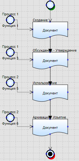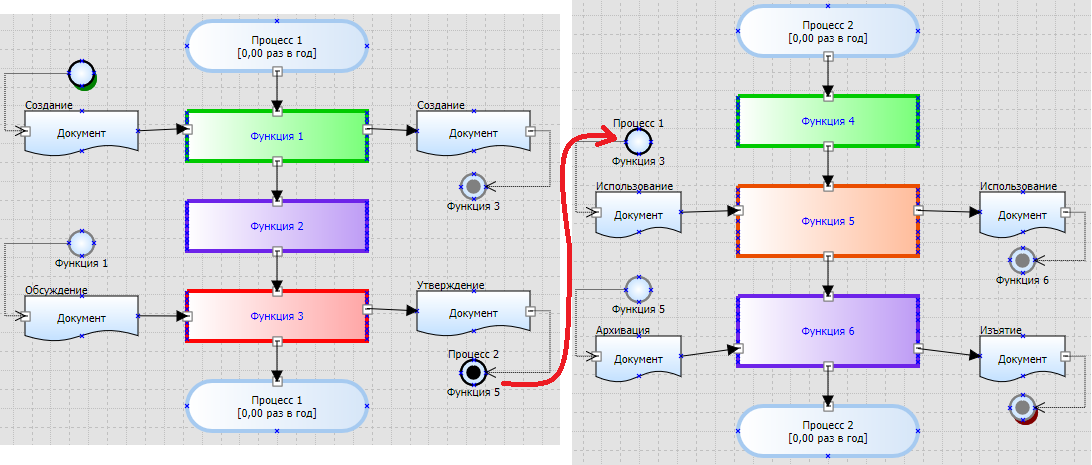 Как видно из рисунка, документ создаётся в функции 1 процесса 1, затем передаётся в функцию 3, где обсуждается и утверждается. После этого документ передаётся в процесс 2, функцию 5, где используется. И в самом конце документ передаётся в функцию 6 где архивируется и изымается из деятельности. Чтобы проанализировать маршрут движения документа нам пришлось держать открытыми сразу две схемы процесса, но программа может автоматически сформировать маршрут движения данного документа в отдельную схему.