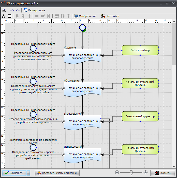 При открытии новой схемы в редакторе программа сформирует диаграмма автоматически. Позже, при необходимости, вы всегда можете перестроить схему заново при помощи кнопки «Построить схему движений» в нижней части редактора схем движений.