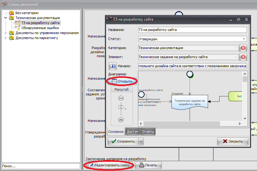 Перейти к редактированию схемы можно нажав кнопку «Открыть» из карточки на схему движений или при помощи кнопки «Редактировать схему» в справочнике «Схемы движений» после выбора соответствующей схемы в дереве.
