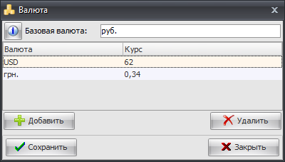 В поле «Базовая валюта» следует указать наименовании валюты, в которой программа будет вести расчёты, например, расчёт стоимости процесса или функции. Остальные указанные валюты будут пересчитываться в базовую валюту по указанному курсу.