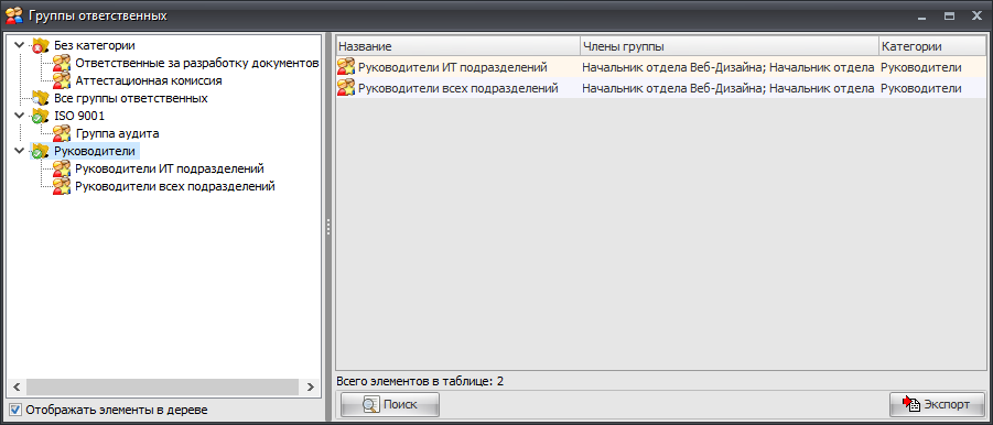 Справочник «Группы ответственных» позволяет объединить должности, внештатные должности и субъекты в группы. Это может быть полезно для тех случаев, когда, группа одних и тех же должностей отвечает за какие-то функции или процессы. Например, если какие-то документы в процессах утверждаются руководителями всех подразделений, то вместо того чтобы напротив функции ставить каждый раз все необходимые должности, можно объединить их в группу «Руководители подразделений» и ставить ответственной за функцию эту группу.