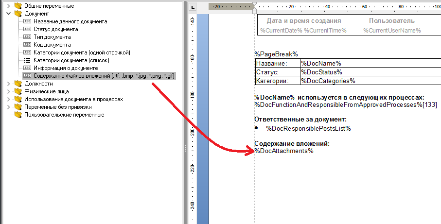 Содержание файлов, закреплённых в карточке на документ можно вставлять в отчёты. На данный момент поддерживаются следующие форматы файлов: .rtf; .bmp; .jpg; .png; .gif