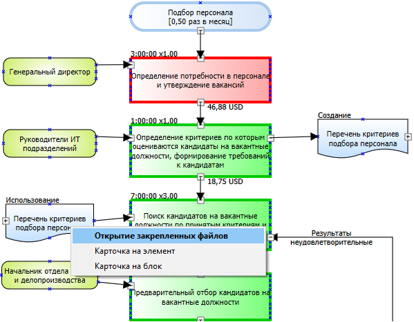 Любые файлы (без ограничений на расширение файла), закрепленные в карточке на документ можно просматривать напрямую на графической схеме процесса, если кликнуть на соответствующий блок правой кнопкой мышки.
