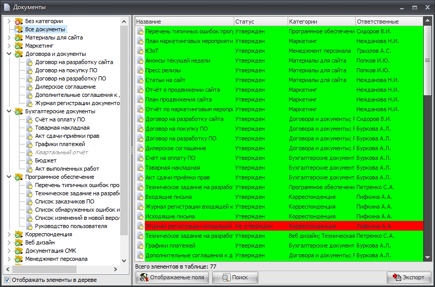 Справочник «Документы» содержит документацию, с которой сотрудники взаимодействуют при выполнении функций в процессах. В этом справочнике мы рекомендуем хранить регламентирующую документацию, например, КЗОТ, регламенты и т.п., а также шаблоны, на основе которых формируются договора, заявки и т.п.