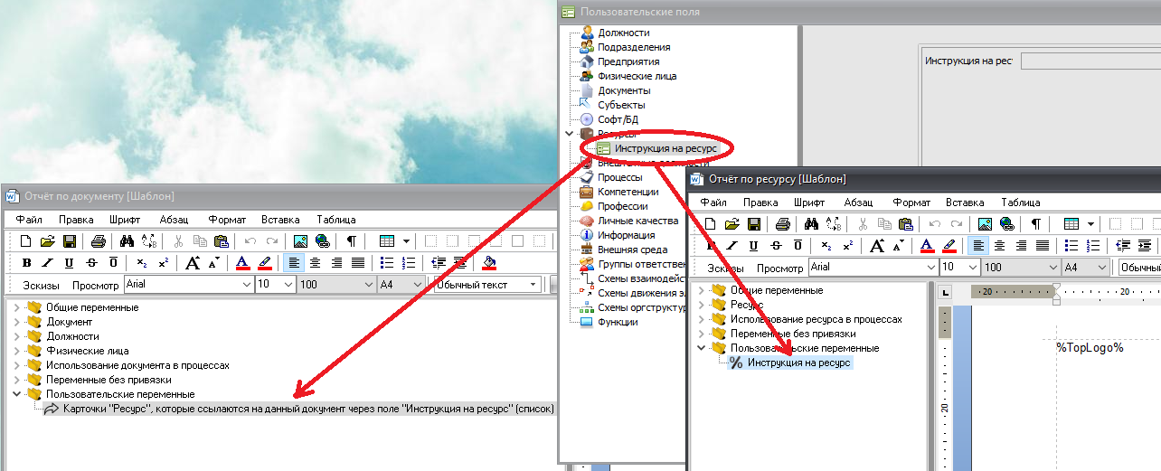 Пользовательские поля типа «Связь с …» создают две пользовательских переменных в отчётах: одну в отчёте на элемент, в котором создано поле и вторую в отчёте на элемент, на который была произведена ссылка. Например, если в карточке на ресурс создать пользовательское поле типа «Связь с документом» и назвать его «Инструкция на ресурс», то в отчёте на ресурс мы получим пользовательскую переменную «Инструкция на ресурс», а в отчёте на документ – переменную «Карточки на ресурс, которые ссылаются на данные документ».