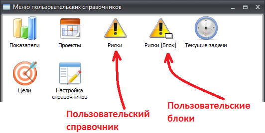 Пользовательские блоки в справочнике отображаются с небольшой иконкой блока в правом нижнем углу. Пользовательские блоки всегда идут в паре с пользовательским справочником и имеют иконку того справочника, с которым связаны.