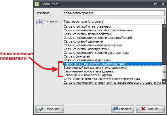 Отдельно следует выделить типы полей «Заполняемые показатели». Данные поля добавляют возможность заполнения данных выбранного типа (цифровые, текстовые и т.п.) в карточке на соответствующий элемент.