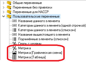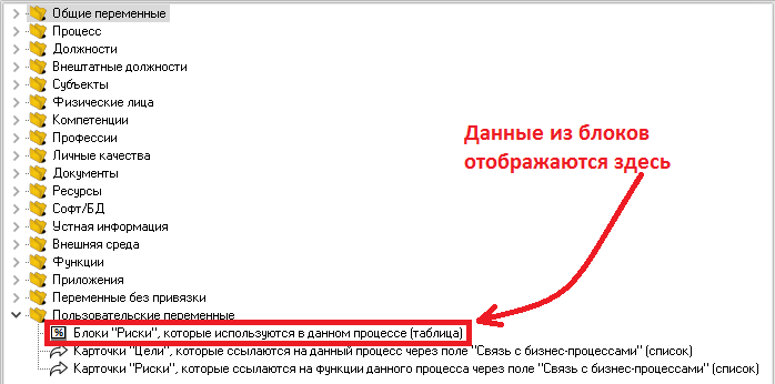 При создании связи с документом, ресурсом и софтом/БД автоматически создаются также переменные, которые позволяют вставлять содержание файлов-вложений из карточек на данные элементы (файлы с расширением .rtf; .bmp; .jpg; .png; .gif), а также переменная, которая позволяет вставлять содержание поля «Код» данных элементов. А при создании ссылки на схему взаимодействия, схему движения или схему оргструктуры, автоматически создаётся переменная, которая позволяет вставлять графическую схему, на которую ссылается выбранный элемент, в отчёт.