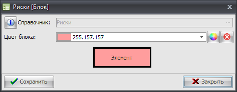 При создании пользовательского блока, необходимо выбрать основной справочник, с которым будет связан наш блок, и цвет, которым будет выделяться блок на графической схеме бизнес-процесса.