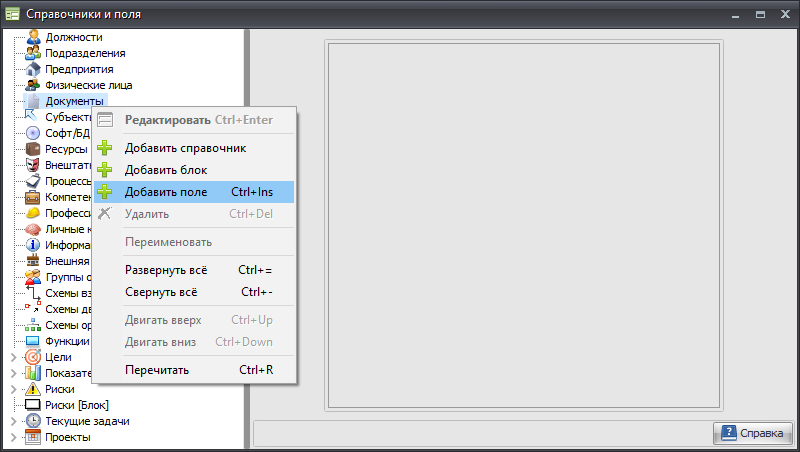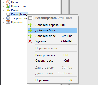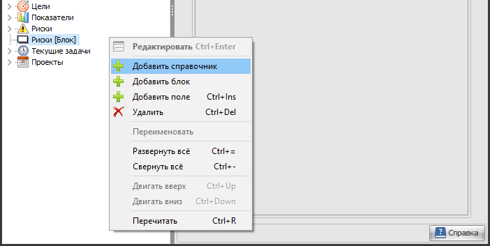 Стандартная бизнес-модель Fox Manager может быть расширена пользовательскими справочниками. Вы можете добавить любые справочники, которые отсутствуют в стандартной поставке программы, например, справочник клиентов, рисков, целей, задач, показателей и т.п.