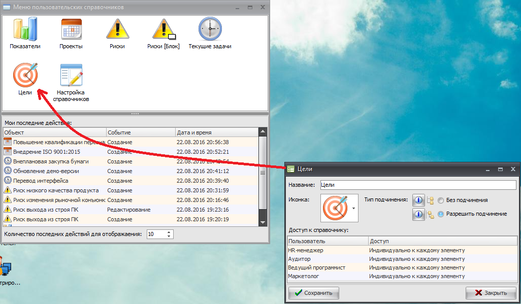 Для нового справочника необходимо задать название, иконку и тип подчинения, а также права доступа к справочнику для всех пользователей текущей базы данных. После этого созданный справочник отобразится в меню пользовательских справочников.