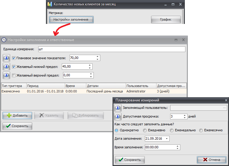 Настройки заполнения, плановое и граничные значения, а также единица измерения индивидуальны для каждого показателя и задаются в карточке на соответствующий элемент. То есть, если вы создали показатель «время выполнения» и закрепили его за справочником процессов, то в карточке на каждый процесс можно задать индивидуальные настройки измерения показателя. Обычно бывает удобно создать отдельный пользовательский справочник показателей со связкой с необходимым элементом и вести его централизовано.