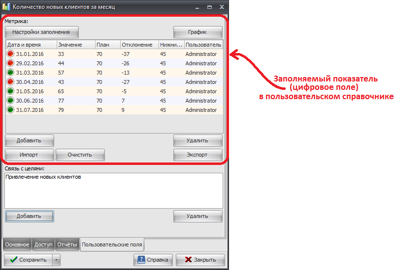 Примером таких полей может служить «время выполнения» в карточке на процесс, «кол-во продаж» в карточке на физическое лицо или любая другая метрика в карточке на стандартный или пользовательский справочник.