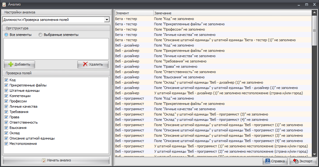 В правой части окна располагается таблица, в которой отображаются рекомендации и найденные замечания. При двойном клике на элемент таблицы пользователь может перейти к редактированию соответствующего элемента. Данную таблицу можно экспортировать и сохранить как файл MS Excel.