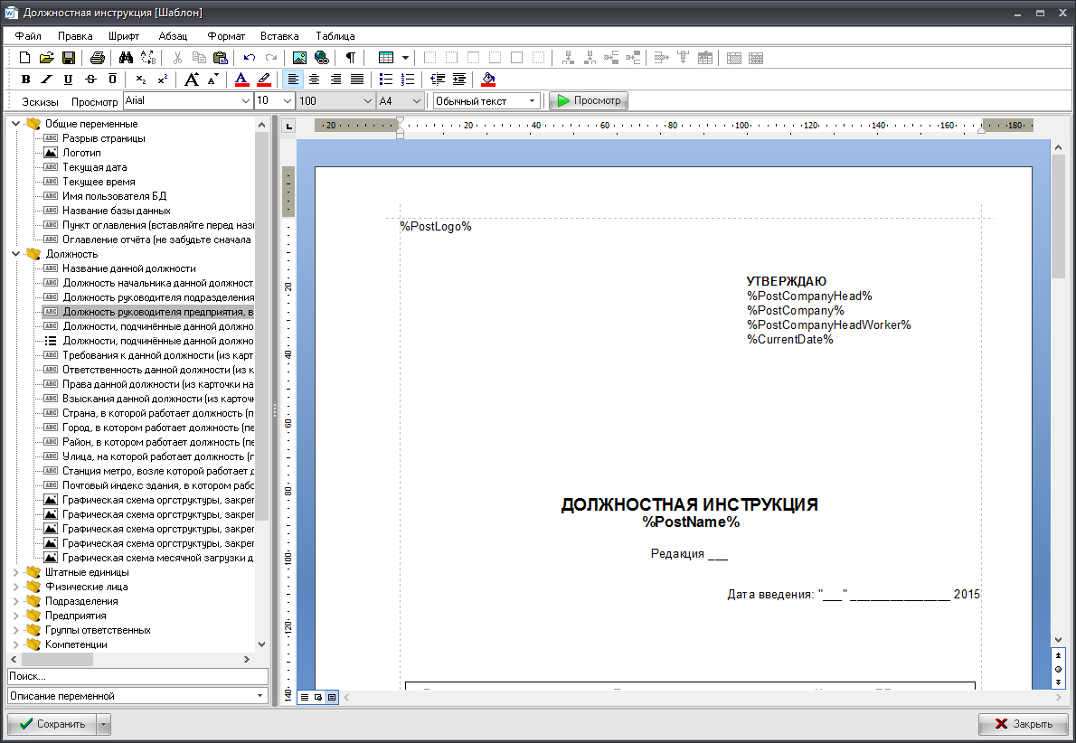 Редактор также позволяет вставлять в содержание отчёта переменные, которые не связаны напрямую с объектом данного отчёта. Например, в отчёт по должности вы можете вставить процессы или документы, которые никак с данной должностью не связаны. Для этого необходимо воспользоваться переменными, которые находятся в категории «Переменные без привязки».