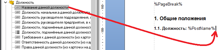 Названия переменных в тексте выделяются по бокам специальными символами «%», то есть переменная в тексте выглядит так: %Переменная%. Вы можете вписывать названия переменных вручную или копировать их из других частей документа через буфер обмена. Если вы допустите ошибку в названии переменной, то она не обработается и её содержание не будет вставлено в отчёт.