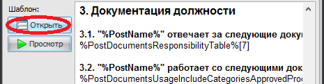 В поле «Шаблон» отображается содержание шаблона отчёта. При создании нового шаблона содержание будет пустым. Для редактирования шаблона необходимо нажать кнопку «Открыть», расположенную рядом с шаблоном.