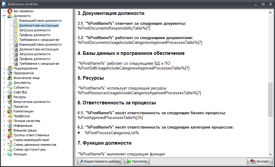 В левой части справочника расположено дерево, в котором отображены типы элементов программы (должности, подразделения, процессы и т.п.) и шаблоны, по которым программа формирует отчёты. Большинство шаблонов отчётов закреплены за соответствующим элементом, например, «Должностная инструкция» за должностью, «Регламент процесса» - за процессом и т.д. Такие отчёты автоматически переносятся в карточку на соответствующий элемент, за которым они закреплены, во вкладку «Отчёты»: