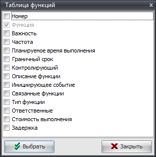 Некоторые переменные имеют собственные настройки содержания. Например, при добавлении в отчёт переменной «Исполнительные функции, которые данная должность выполняет в утверждённых процессах» откроется окно с настройкой столбцов таблицы функций, которые будут перенесены в отчёт.