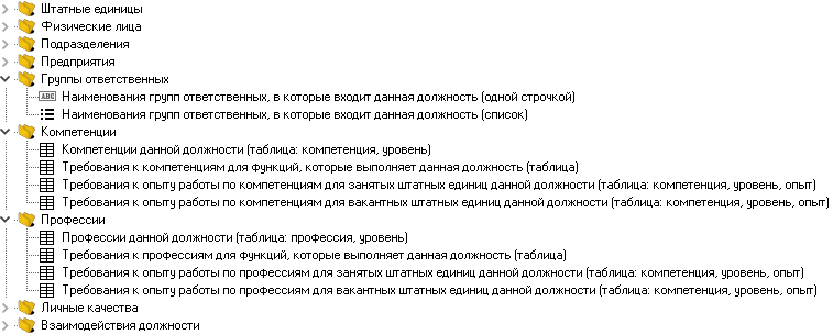 Дерево переменных содержит только те переменные, которые актуальны для данного типа отчёта, то есть переменные, которые используются в отчёте на должность будут отличаться от переменных, которые используются при формировании отчёта на процесс.