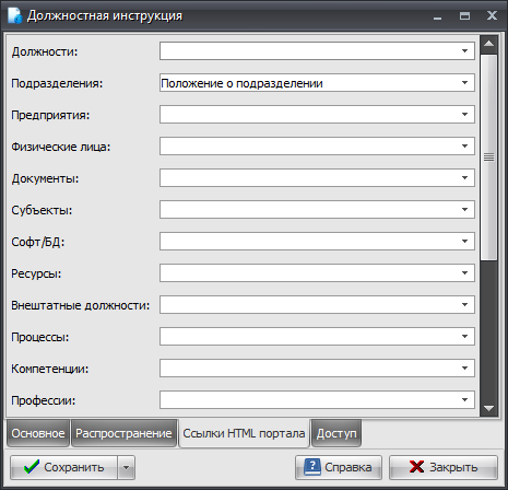 Во вкладке «Ссылки HTML портала» можно указать ссылки на соответствующие отчёты, для элементов, которые используются в текущем шаблоне отчёта. Например, вы можете указать, что все ссылки на подразделения, которые упоминаются в данном шаблоне отчёта «Должностная инструкция» должны вести на отчёт «Положение о подразделении».