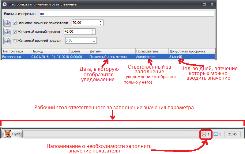 Когда за заполнение показателя назначается ответственным пользователь базы данных, то ему приходит уведомление в день измерения, а также ещё на протяжении нескольких дней (в зависимости от допустимой просрочки).