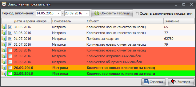 Галочкой отмечаются показатели, которые были заполнены вовремя. Зелёным цветом выделяются показатели, которые необходимо заполнить сегодня, оранжевым цветом – показатели, срок заполнения которых уже истёк, но, заданная в настройках заполнения допустимая просрочка ещё позволяет ввести значение задним числом. Красным цветом выделяются показатели, которые были просрочены и ввести значение которых уже невозможно из-за того, что истёк срок допустимой просрочки заполнения показателя.