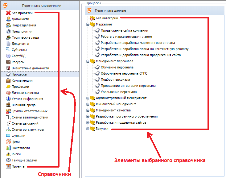 В левой части окна перечислены все справочники программы Fox Manager BPA. Индивидуальный доступ к элементам и справочникам настраивается из программы Fox Manager BPA, пользователь портала «видит» те же самые элементы и справочники, которые ему доступны из программы Fox Manager BPA.